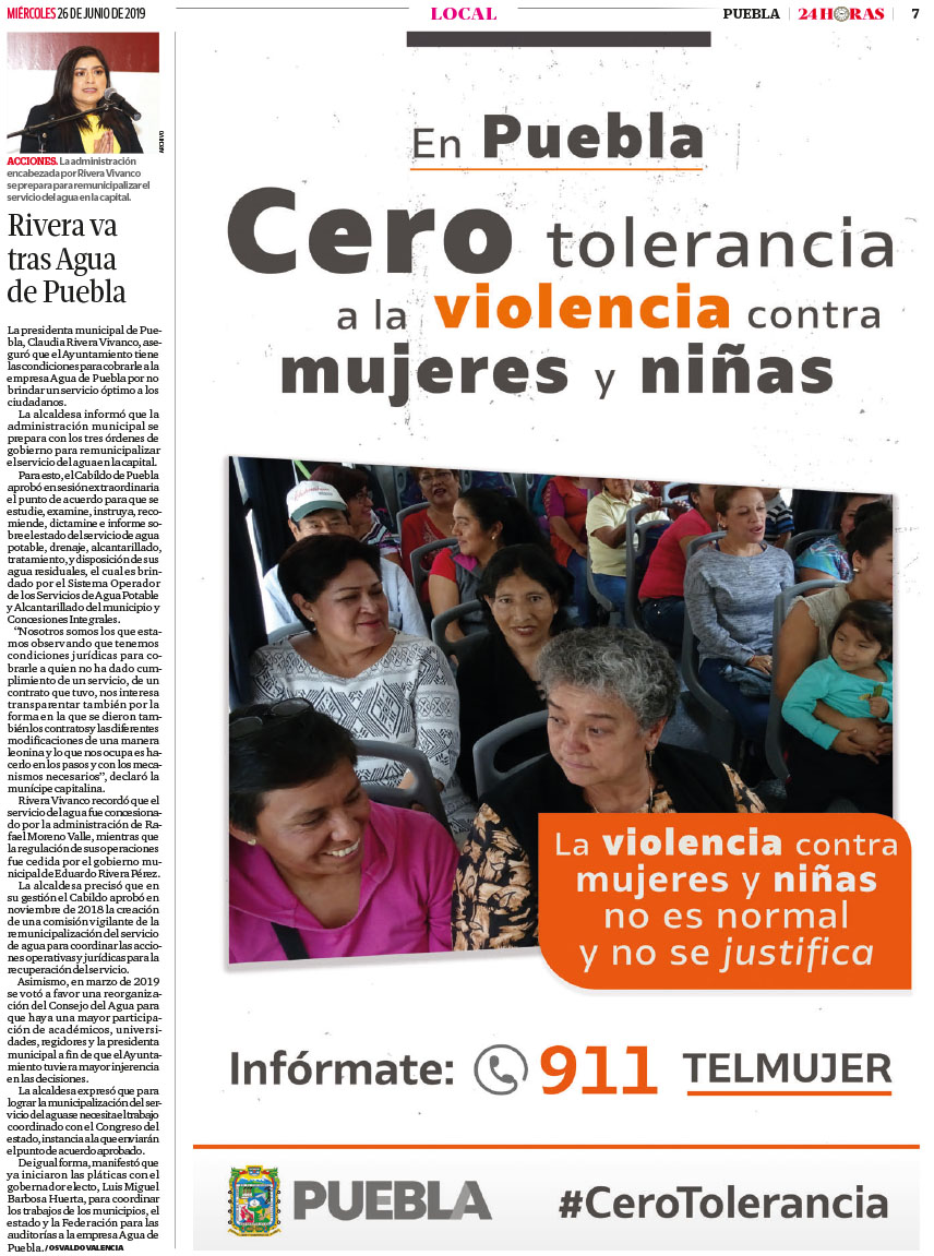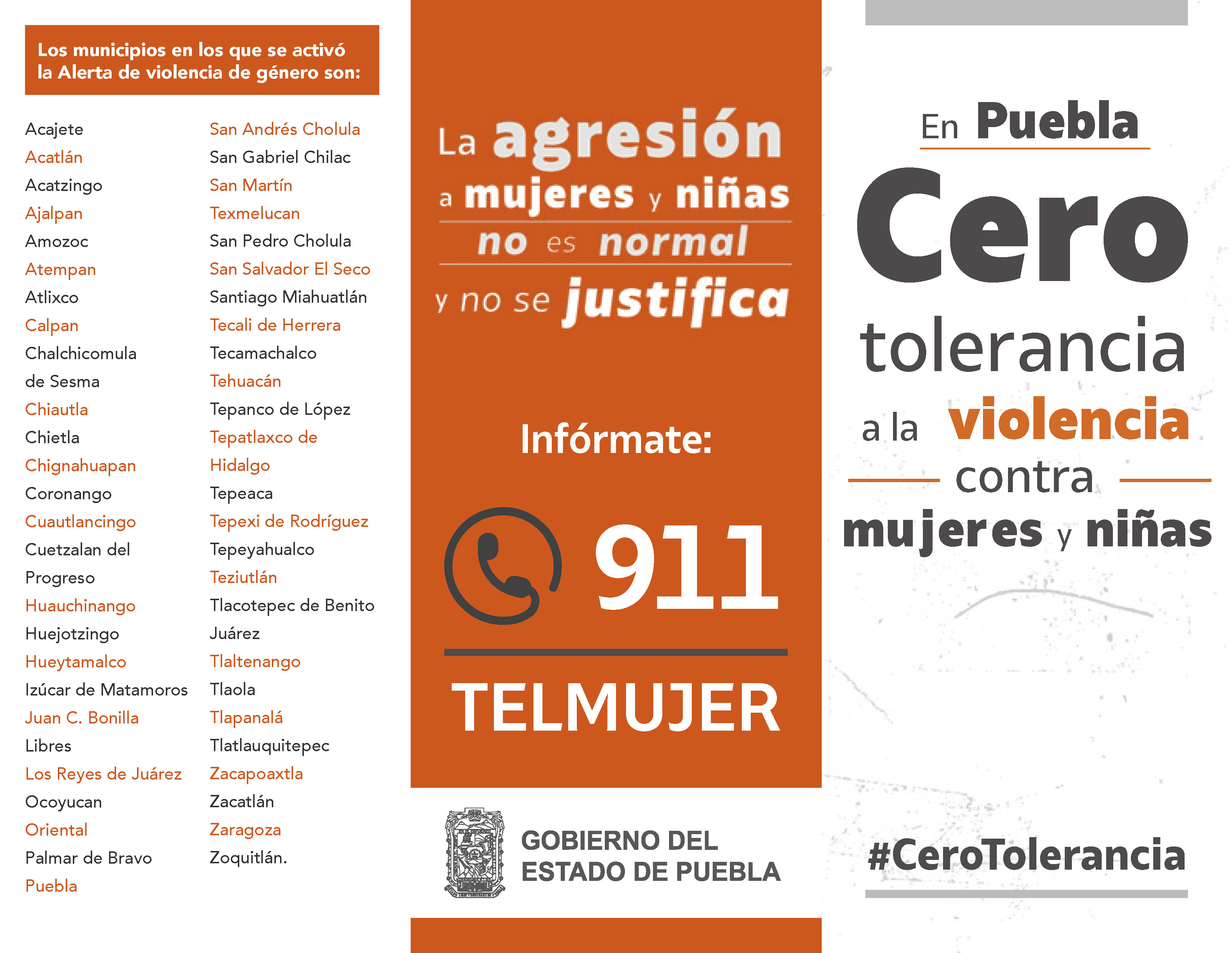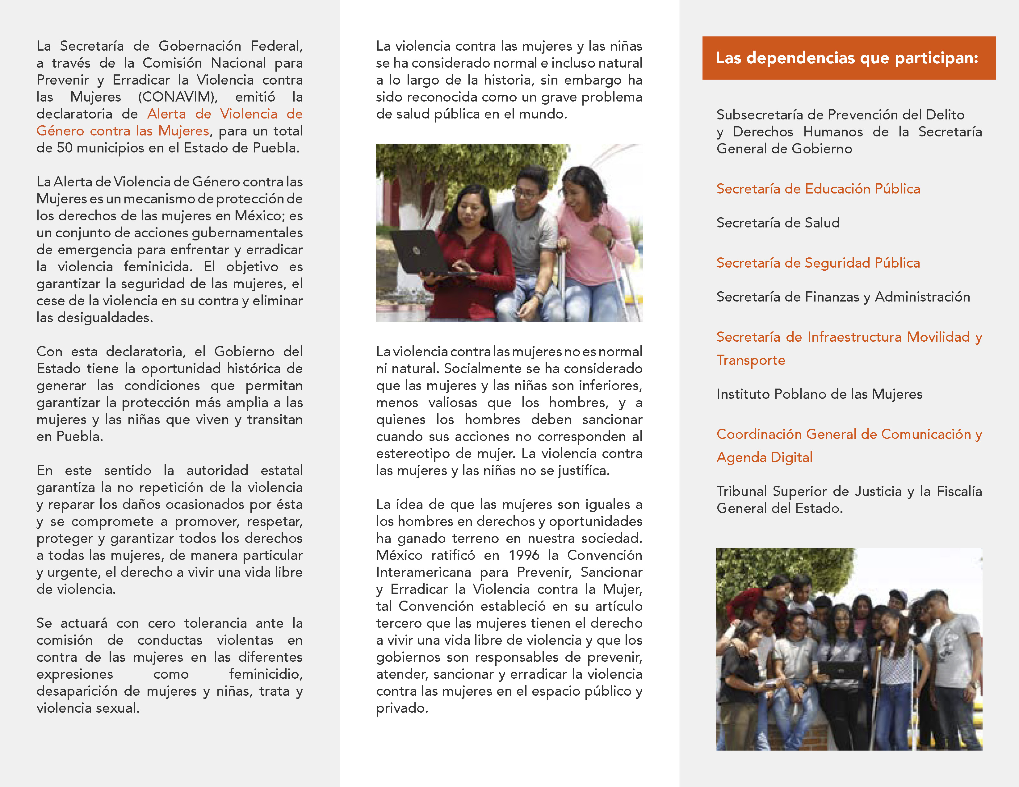La Alerta de Violencia de Género contra las mujeres (AVGM) es un mecanismo de protección de los derechos humanos de las mujeres único en el mundo. En Puebla, la Declaratoria de AVGM se emitió el 8 de abril de 2019, para 50 municipios de la entidad, e incluye 45 medidas de prevención, seguridad y justicia. Como respuesta, el Gobierno del Estado ha implementado un Plan de Acción que contiene 159 acciones específicas. Este Plan hace evidente el trabajo coordinado que realizan los Poderes del Estado, a través de las dependencias de la administración pública, las instancias de procuración de justicia, y la sociedad civil. Conoce los avances al Plan en este sitio.
