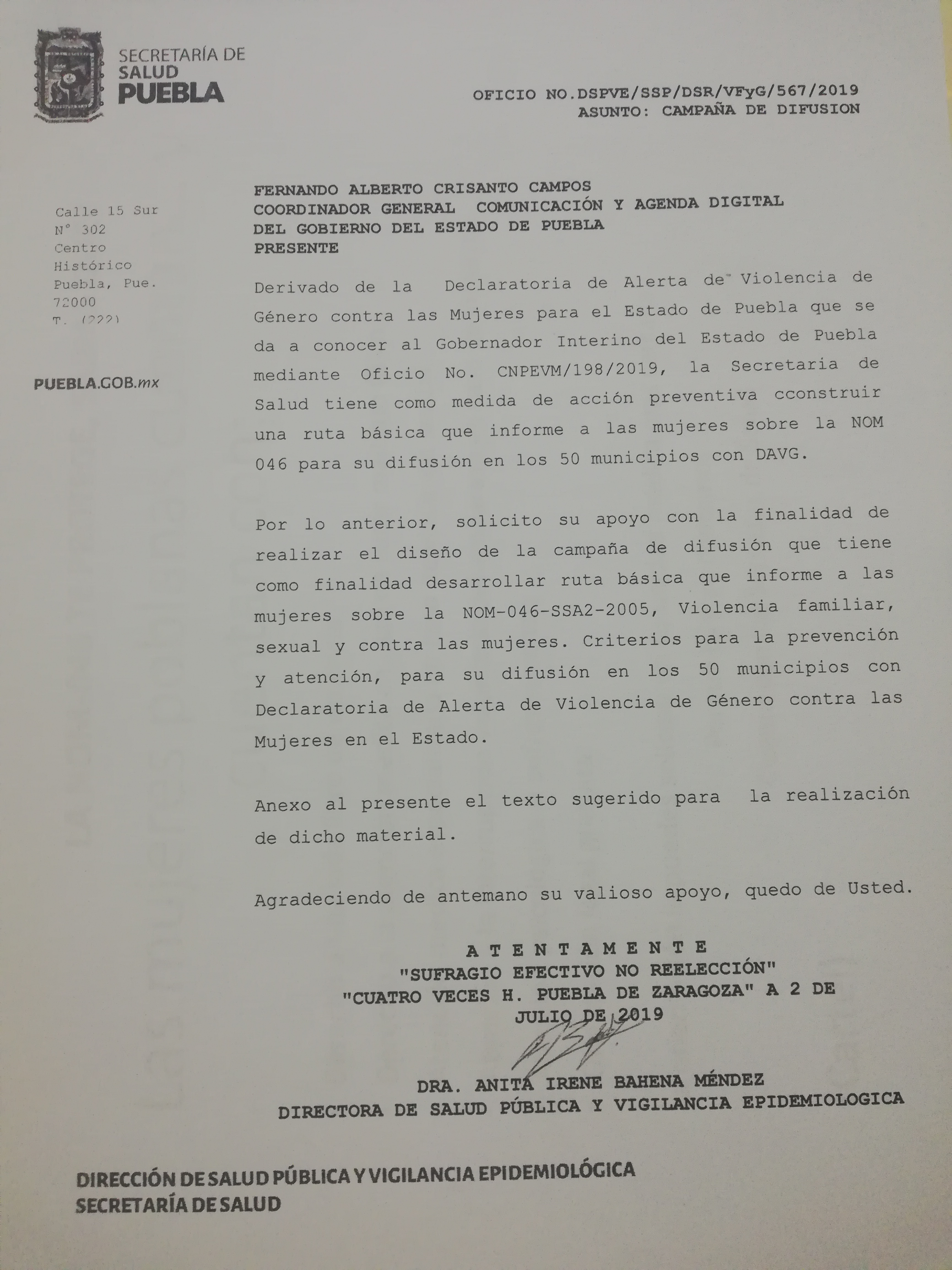La Alerta de Violencia de Género contra las mujeres (AVGM) es un mecanismo de protección de los derechos humanos de las mujeres único en el mundo. En Puebla, la Declaratoria de AVGM se emitió el 8 de abril de 2019, para 50 municipios de la entidad, e incluye 45 medidas de prevención, seguridad y justicia. Como respuesta, el Gobierno del Estado ha implementado un Plan de Acción que contiene 159 acciones específicas. Este Plan hace evidente el trabajo coordinado que realizan los Poderes del Estado, a través de las dependencias de la administración pública, las instancias de procuración de justicia, y la sociedad civil. Conoce los avances al Plan en este sitio.